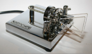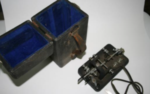 This is a unique Vibroplex style key. It comes with a fitted case and appears to be fairly old. The connector at the end of the wire is a flat connector which I’ve never seen before. |